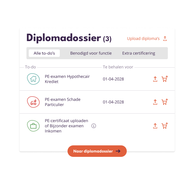 Als adviseur ben je wettelijk verplicht om je vakbekwaamheid aan te kunnen tonen. Het is daarom belangrijk dat je Diplomadossier volledig gevuld is, zodat je richting je werkgever kunt aantonen dat je vakbekwaam bent. Daarnaast kunnen we jou voorzien van persoonlijke to-do's zodat je precies weet wat je moet doen om vakbekwaam te blijven.