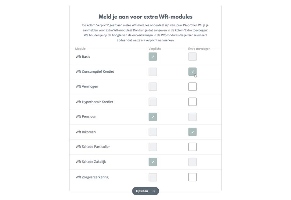 Dit doe je door naar ‘Extra modules kiezen’ te gaan. Je komt dan op het scherm ‘Meld je aan voor extra Wft-modules’. Hier vink je aan welke modules je ‘extra’ wil toevoegen. Vervolgens klik je op ‘Wijzigingen opslaan’ om je keuze te bevestigen. Vanaf nu ontvang je de artikelen van de extra Wft-modules die je hebt geselecteerd onder ‘Zelf gekozen’.