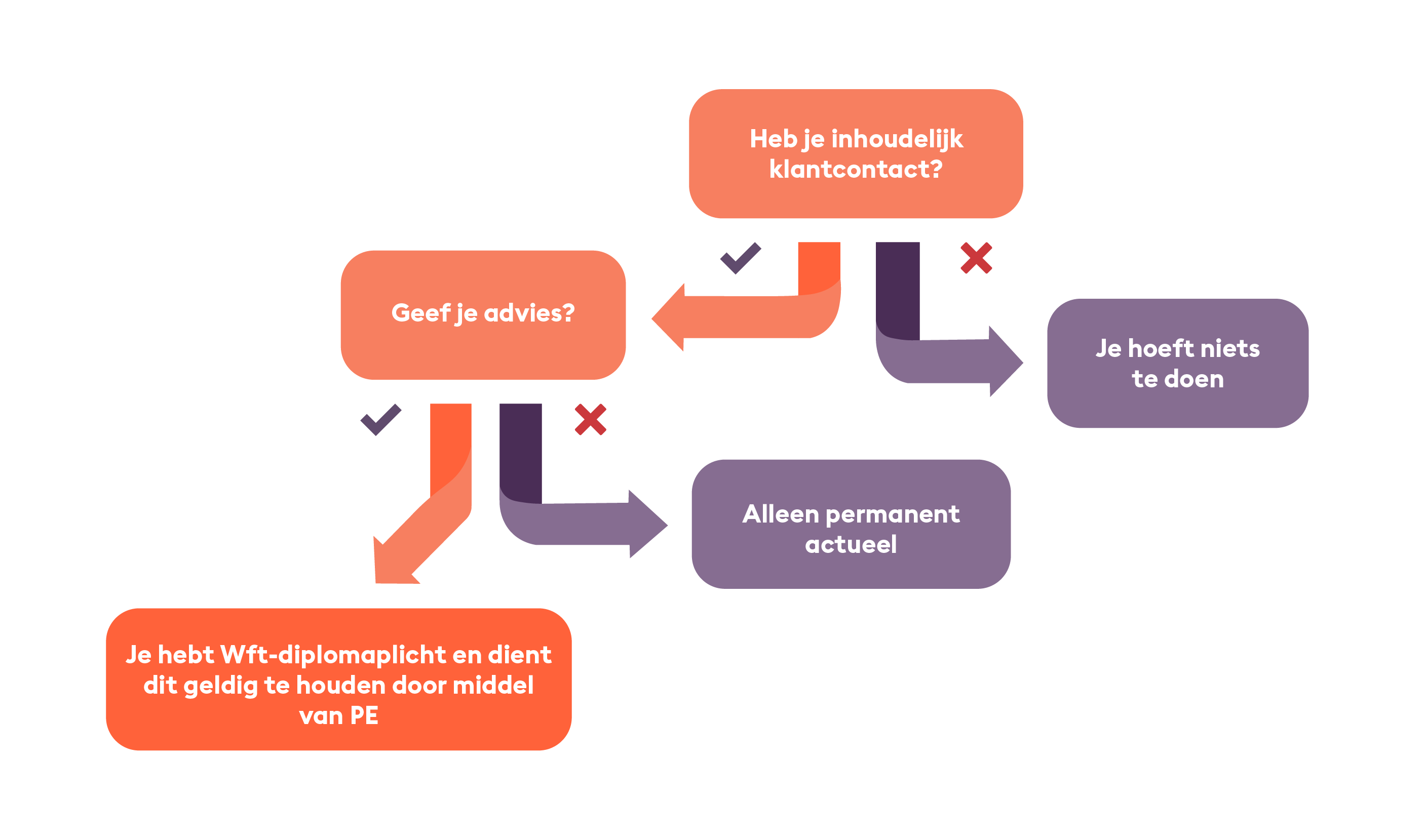 Niet iedereen binnen de financiële dienstverlening hoeft aan de beroepskwalificaties te voldoen. Hiernaast vind je een schematische weergave van wanneer deze wettelijke bepalingen op jou van toepassing zijn.